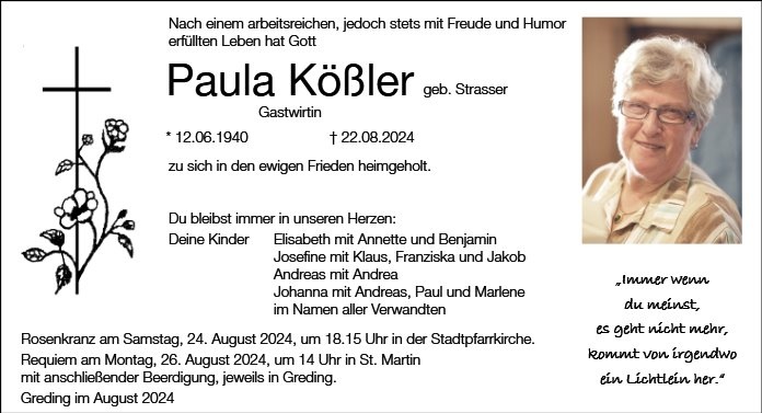 fast zwei Jahrzehnte durften wir bei Ihrer Mutter zu Gast sein. In all den Jahren hat sie alles getan, damit wir uns wohlfühlten und sie hat uns als Gäste auch manchen Wunsch erfüllt, der nicht selbstverständlich war. Wir werden Paula Kößler immer als liebevollen Menschen in Erinnerung halten.